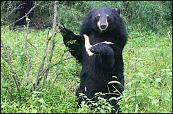 As part of Bear Awareness Week, I thought I’d share the plight of the Asiatic Black Bear (also called the Moon Bear for the yellow crescent across their chest). I first learned about this bear at a bear-keeping conference I attended last year. Our keynote speaker was Jill Robinson, founder of Animals Asia Foundation, who works on Moon Bear rescues, and by the end of her talk the whole audience was in tears. While China works on a “green” Olympics for this summer, bear bile farming operations are still widespread.