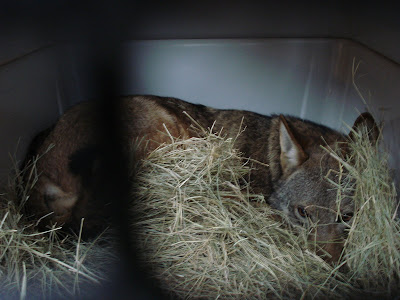 #1369 was living at the Wolf Conservation Center in New York. I dropped the carrier off on Sunday and they packed him up early this morning. It’s not a great photo, but that’s him curled up in the carrier buried in some hay. He is very shy in general, and seeing that everything is new, he was very skittish when we let him into the side cages of our exhibit.