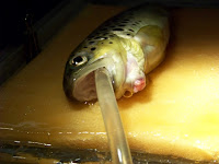 Our prescription was to watch to make sure the fish continued to eat and that the “wound” continued to improve.It has now been over a week since our visit and the trout continues to eat well and look fine. We may catch it again soon to see how the tongue is progressing, if so we will post an update.