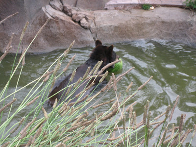 I discovered that different species of bears eat watermelon differently when I was doing Animal Enrichment activities at the Kathmandu City zoo: Sloth Bears (who live in the lowland jungles and eat ants and termites) rip the melons open with their extra long claws and slurp the juicy bits up with a sound remarkably like a hoover vacuum cleaner leaving the rind, Himalayan Black Bears (live much higher in the mountains and have a diet similar to the North American Black bear) on the other hand sit on their haunches with the watermelon in their "laps" and very neatly and carefully eat the rind and melon together, spiraling down from the top to the bottom and not spilling a single seed! (sample size of two bears of each species) it would be interesting to compare the watermelon eating habits of even more bears around the world!!