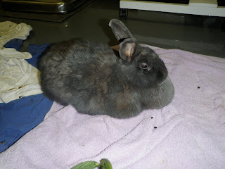 When I went to move her, she was having trouble getting her feet beneath her. I was pretty worried. When we see an animal lying with their legs to the side when they usually don’t, that usually means something is wrong with their back. Rabbits especially have sensitive backs that get hurt pretty easily. I brought her down to the building, and she went for x-rays on Tuesday. Luckily her back is just fine. The prognosis is that she has arthritis in many of her joints. We got Nimbus when she was already full grown, so we don’t know how old she is exactly, but while back Dr. English, our eye specialist, said that based on her eyes, he thought she was an older bunny.