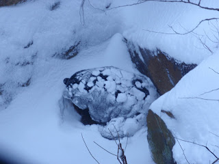 That’s Larry and Sherry driving in the other vehicle. The video stops there because Cassidy had to get out to check on Virginia up on the cliff (her boyfriend, Trace, was taking the video, and I was working inside). Up on the cliff of the bear exhibit is a place called The Pit. It’s basically a pit that the bears like to sleep in. It’s Virginia’s favorite hangout. Here she is all snow covered: